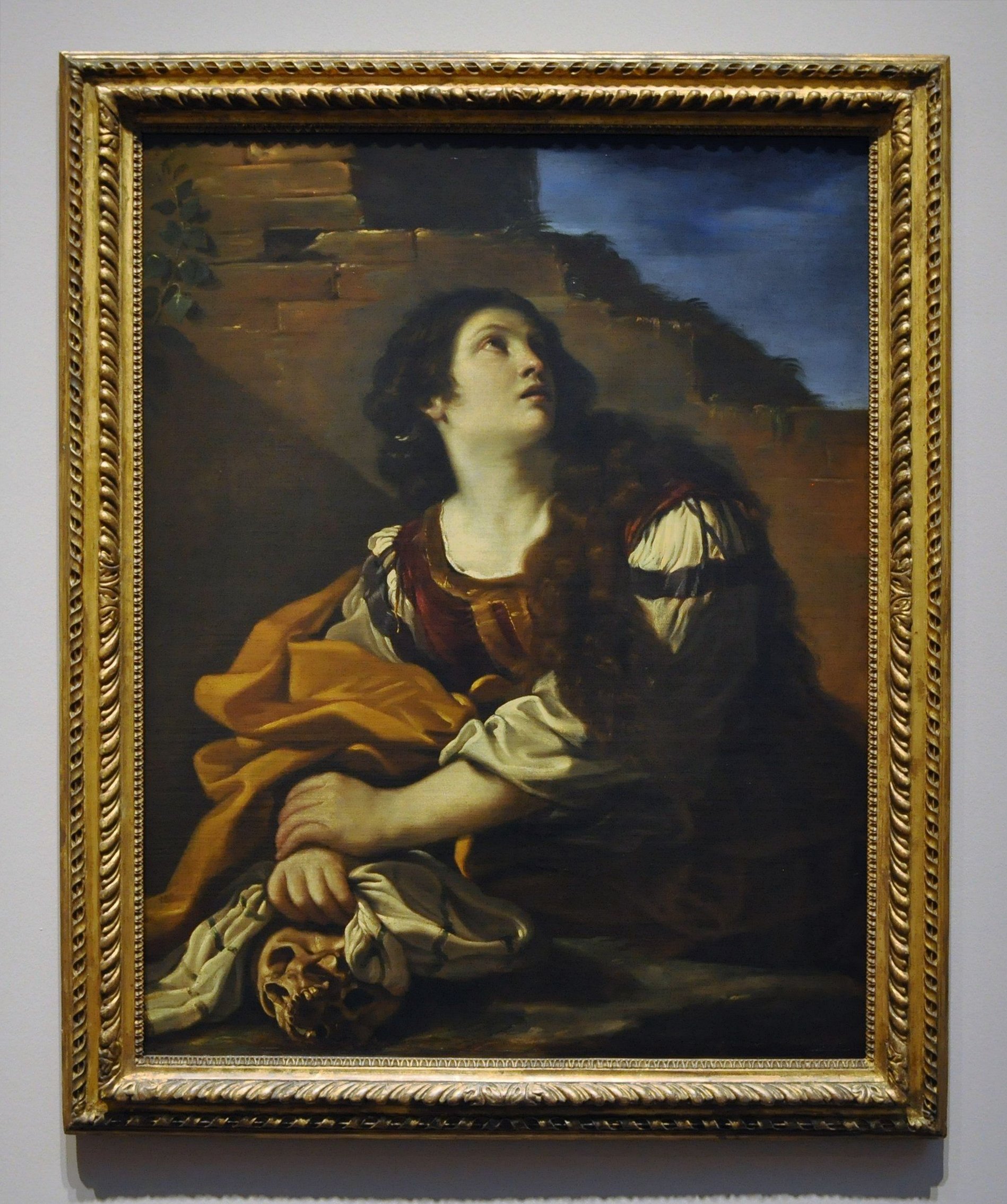 Transcending he contemplation of death and repentance of sins, the Magdalene looks heavenward in a rapture that is echoed by a shaft of light. This painting is an excellent example of Guercino’s shift from the exquisite, intuitive naturalism of early works, like the Landscape (below), to a more deliberate, constructed, and self-consciously dramatic style after his experience of Caravaggism during a sejourn in Rome (1621-23). Because this figure derives from Guercino’s own painting of around 1619, a Raising of Lazarus, now in the Louvre, the development is especially clear.