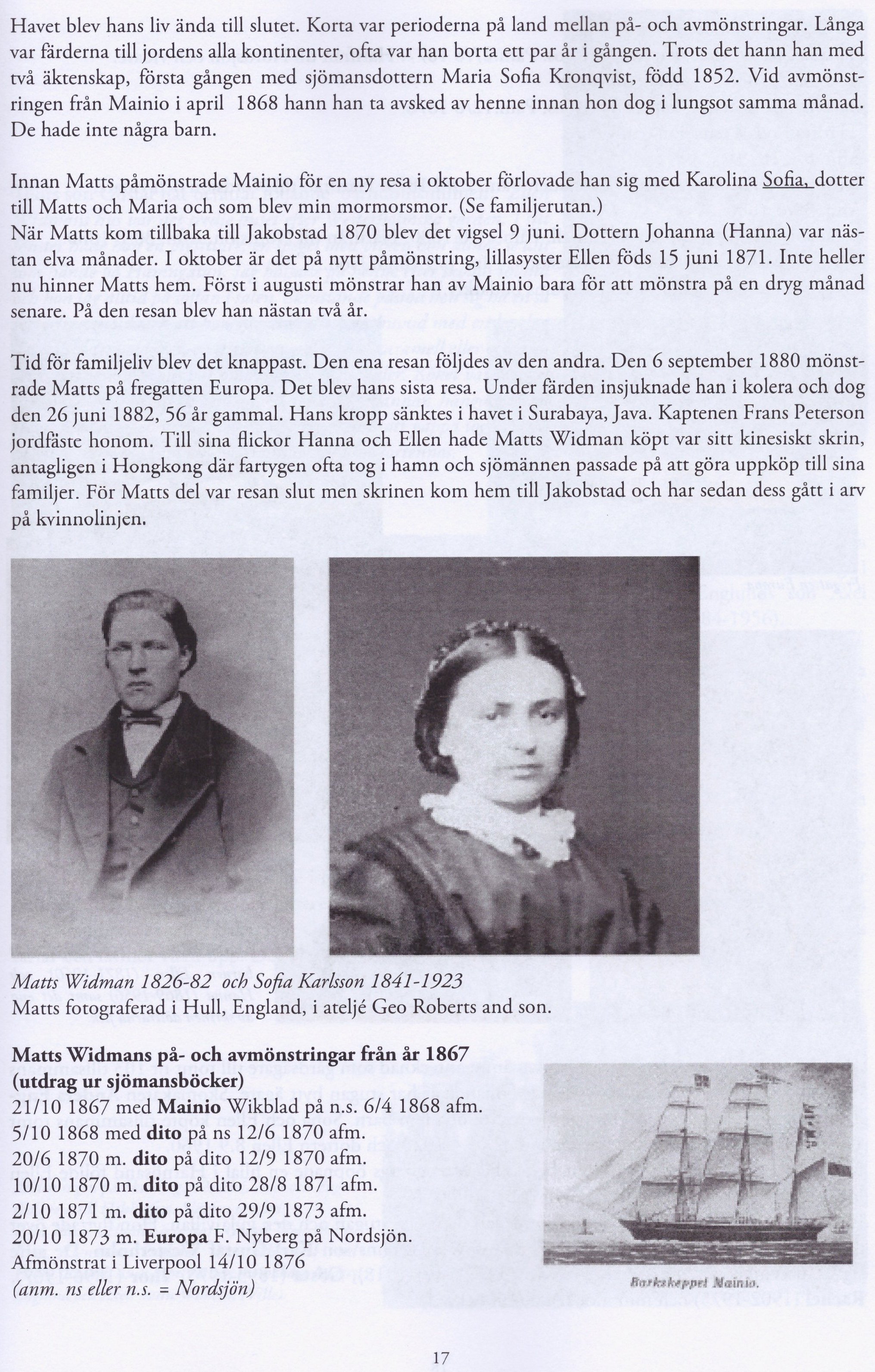 For Matts Widman the sea became his life until the bitter end. The periods on land between pay days and new enrollments were short. But the sailings through all the world's continents were often long, for a couple of years at a time. In spite of that, he had time to marry twice, first to a sailor's daughter, Maria Sofia Kronqvist, born in 1827. He left the job from the ship Mainio in April 1868. He had a chance to say goodbye to Maria before she died of tuberculosis the same month. They had no children.