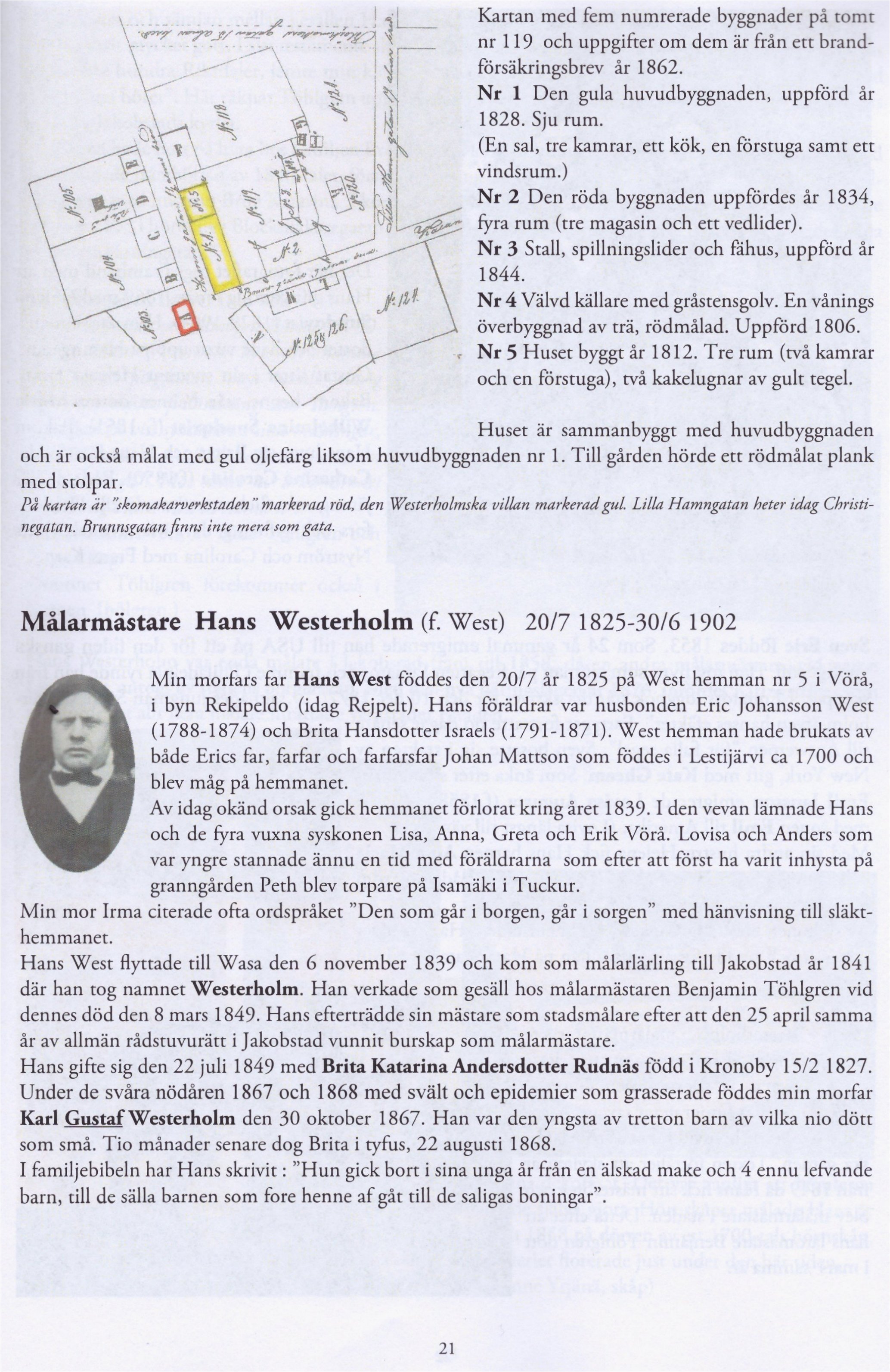 Hans West moved to Vasa 6 November 1839 and came as an indentured painting servant to Jakobstad in 1841, where he took the name of Westerholm. He worked as a servant for the painter Benjamin Töhlgren. When Benjamin died 8 March 1849, Hans took over his master's business and on 25 April of the same year, the justice department of Jakobstad awarded him the title of master painter.