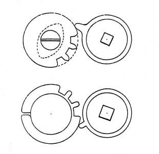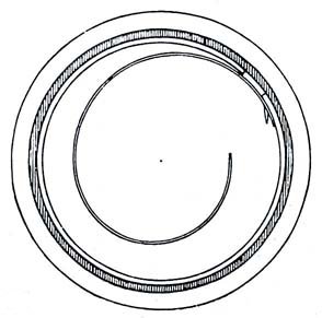 1) The lack of a clear indication that the end of winding has been reached. This objection can be overcome by making 3 or 4 vertical cuts on the inside wall of the barrel and giving the end of the spring a weak outward bend, so that it penetrates a little into one of these recesses. When the highest tension is reached the end of the spring is no longer held back by the recess and it slides into the next, making a quiet but audible noise indicating that winding should cease. At the same time this sudden small movement can be felt.