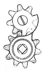 42. With frictional stopwork, which is not seen very often in watches, a wheel with 3 or 4 teeth is usual, while the remainder of the wheel is left uncut. This wheel is screwed onto the plate by a shoulder screw and the end of the barrel arbor carries a finger or tooth, which meshes with the wheel teeth; and with each revolution of the barrel arbor it rotates one tooth. At the start and end of winding the finger presses against the full part of the wheel and prevents further movement of the barrel arbor in that direction. It is apparent that the wheel is not held during the whole time between two rotations of the finger, and an outside vibration could make it turn around on its axle if its freedom to move were not controlled by a spring washer producing sufficient friction. Sometimes the stop wheel is turned off to a thin rim and slit opposite the teeth, so that it can be sprung onto a slightly under-turned stud on the barrel cover, where it will hold itself without a screw or a spring.