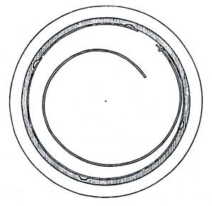 43. To the same class belongs a kind of stopwork with a type of internal gear. An eccentric circular groove is turned in the barrel cover and is undercut at its outside edge. This groove contains a circular spring on whose internal edge some teeth are cut, into which the stop finger meshes; when the stop finger comes into contact with the uncut parts of the spring, winding stops. The friction of this spring in its groove prevents unwanted movement. This arrangement has the same problems as the previous.