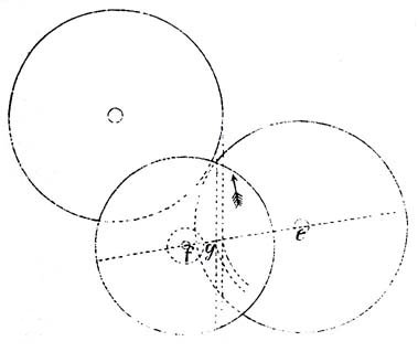 The pressure on the fusee pivot in English work is greatly increased by this constructional defect. Fig. 32 shows the positions of the fusee and centre wheels. To determine the pressure on the pivot we assume the point of contact between the wheel and pinion at f is the fulcrum of a lever, at whose other end g the force is transferred by the chain. It does not require a proof that the pressure on the fusee pivot at c is nearly double the pressure exerted at g.