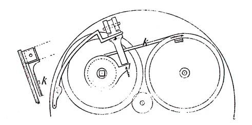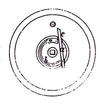 It consists of a narrow steel slide a, which fits firmly in a groove in the upper surface the fusee but can slide in this groove. It lies level with the upper fusee-chain groove and may not extend below it. By means of a weak spring b, which is pivoted in the upper surface of the fusee, the slide is pushed back so that its rear end stands out from the upper fusee groove somewhat. When winding, the last turn of the chain takes up its proper position in the highest groove and it presses the slide inward, whereby the other end of the slide c leans against a screw or a strong pin and further winding prevented. Naturally this does not require a fusee beak; instead a round plate is screwed to the fusee which holds the slide and spring in their place.