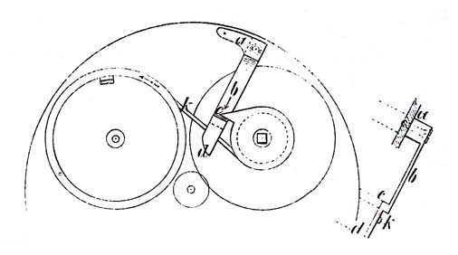 Now, if the chain is completely wound on the fusee it pushes the spring arm towards the upper plate until the beak meets the shoulder at c and further winding is prevented.