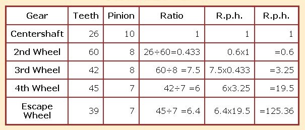 minute and pendulum length is on page 79 of the same. These table make calculations much easier. However, not all gear combinations are listed, so I have chosen a common clock, the gear combination of which is not listed, for a worked example, (method #1), that assumes no available