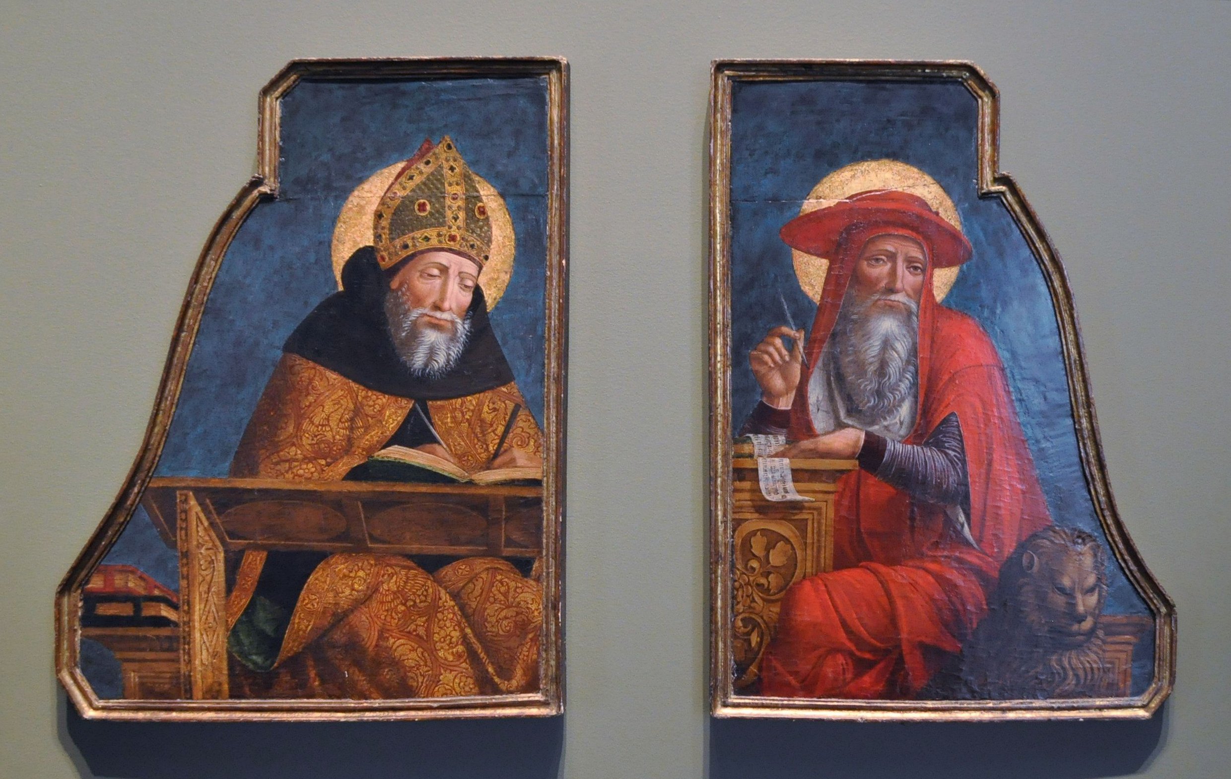 These two panels represent St. Augustine and St. Jerome at study. With Ambrose and Gregory, they comprised the Doctors of the Church, the most important early Christian theologians. The size, matching shapes, and low viewpoint of these panels indicate that they originally formed the upper corners of a two-staged, multi-paneled altarpiece. Such polytychs with their sharply defined shapes and bright colors remained popular with conservative patrons into early 16th–century Milan. Bevilacqua was a leading painter of this stylistic tendency.