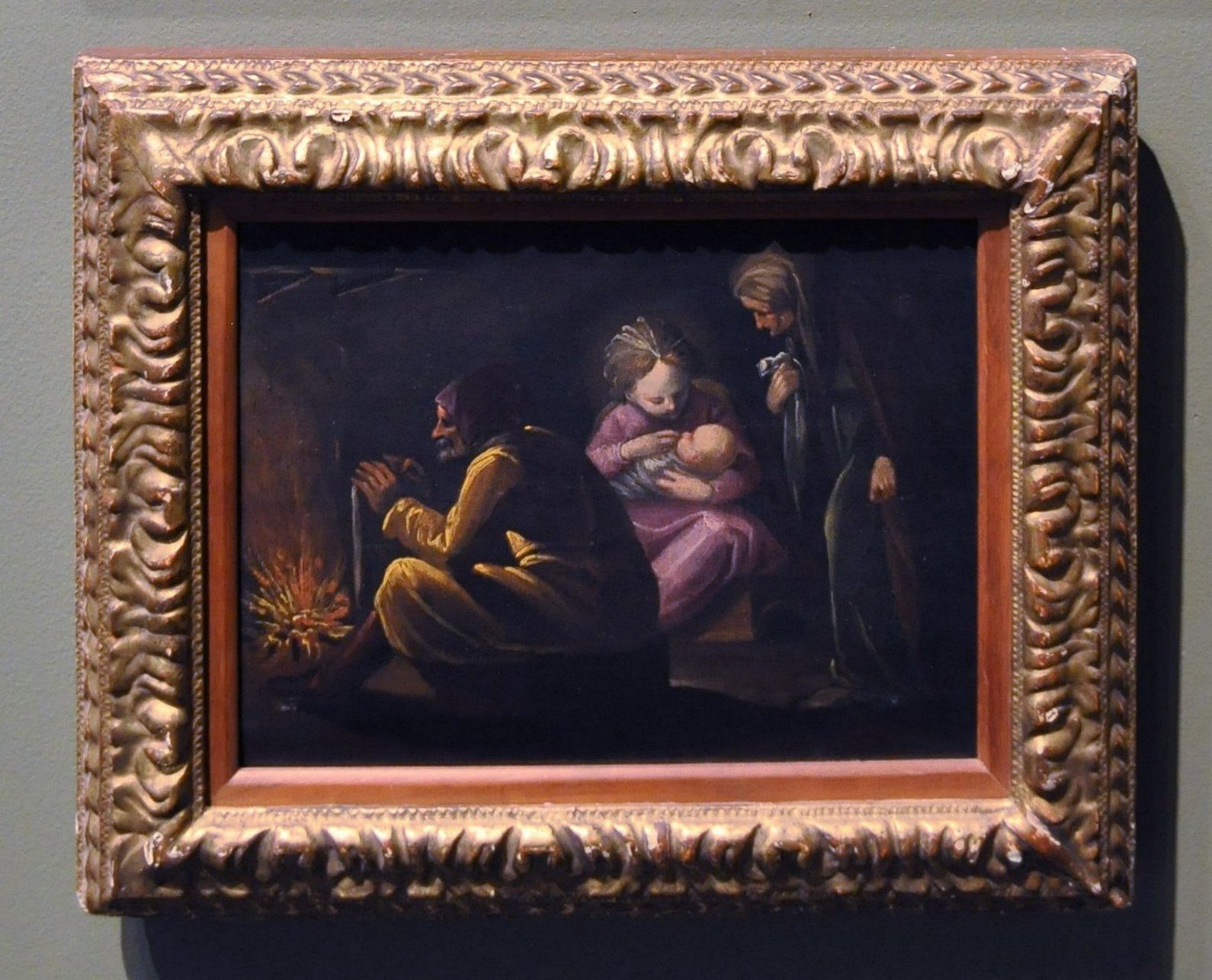 This is an apocryphal scene from the infancy of Christ. Such charming, anecdotal variations were inspired by the popularity of Netherlandish genre paintings and conditioned by the Counter-Reformation’s imperative that religious imagery engage the viewer. In his late devotional paintings, Luca Cambiaso often used nocturnal settings to increase the sense of intimacy and mystery, and his late drawings include many versions of this subject. The combination of these elements in the present painting has led some to attribute the work to Cambiaso himself. Yet, the uncertain relation between the figures and the heavy touch indicate that it is instead the work of a close follower, possibly his son, Orazio.