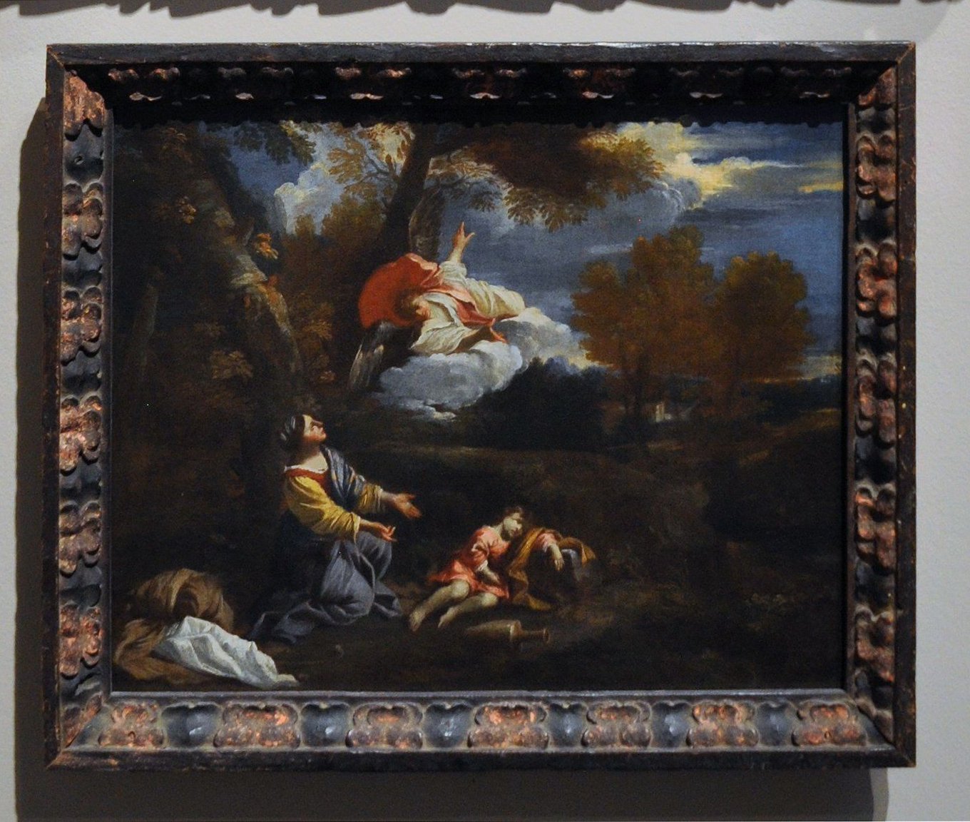In a popular story from Genesis, Abraham exiles his mistress, Hagar, and their son, Ishmael, to the wilderness, where they are saved from thirst when an angel shows them a spring. The classical style had come to dominate painting in Rome during the second quarter of the seventeenth century. A painter of Lombard origins, whose style was forged during a period in Venice, Mola reasserted the rich palette, suffused light, and sensory appeal of the early Baroque. His small-scale landscapes, like this one, are especially coherent and warm.