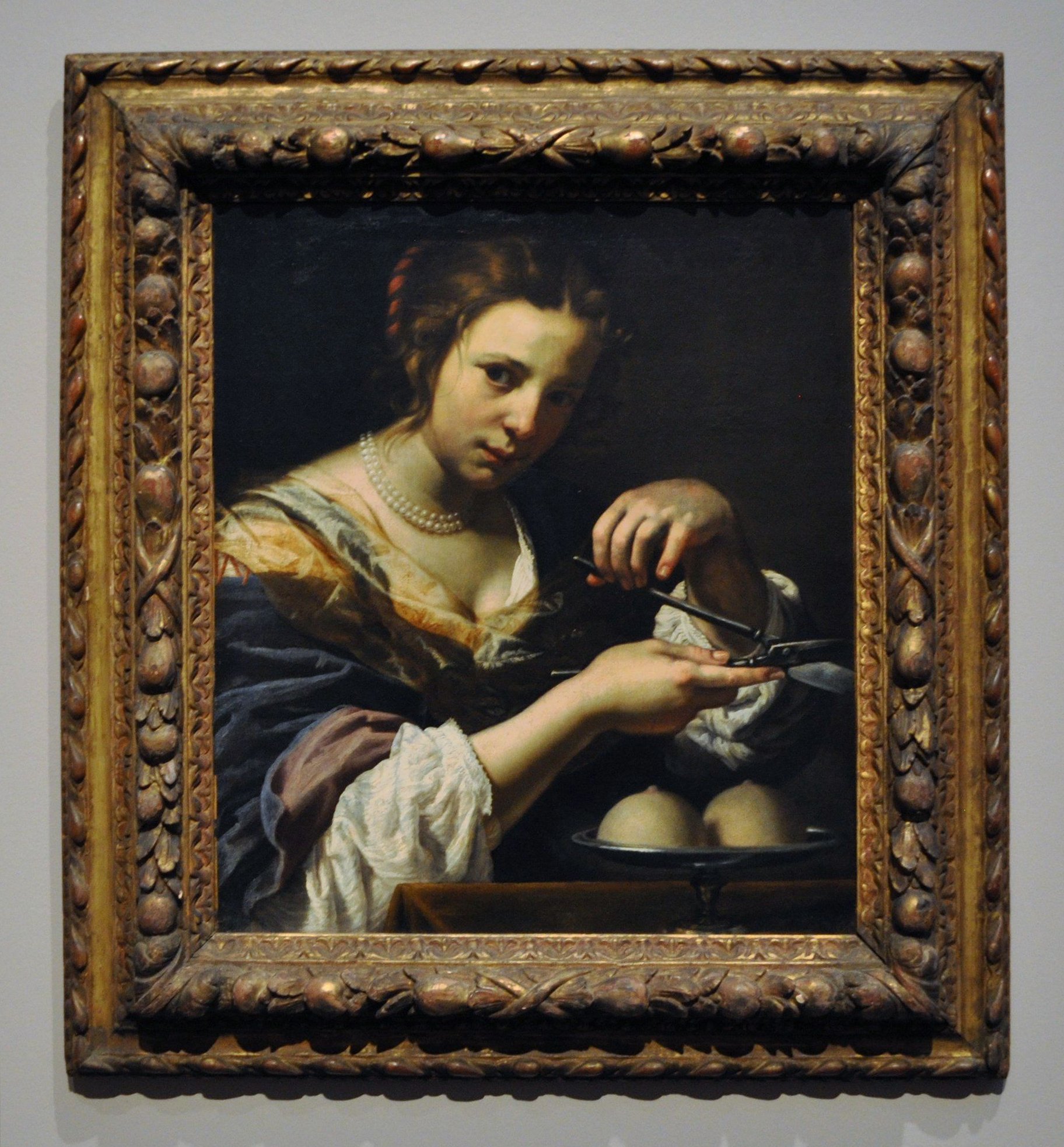 Half-length female figures of devotional or allegorical subject by incorporating such prurience were popular in mid-seventeenth-century Florence, partly as a conservative response to the extroverted, fully Baroque decoration of Pietro da Cortona in the Palazzo Pitti. Lippi cultivated his own idiom by returning to the precise description and sterling character of Santi di Tito’s paintings. Previously attributed to Orazio Riminaldi, an earlier Caravaggesque painter active in Pisa, this Saint Agatha has been described recently as “one of Lippi’s most fascinating religious personalities.”