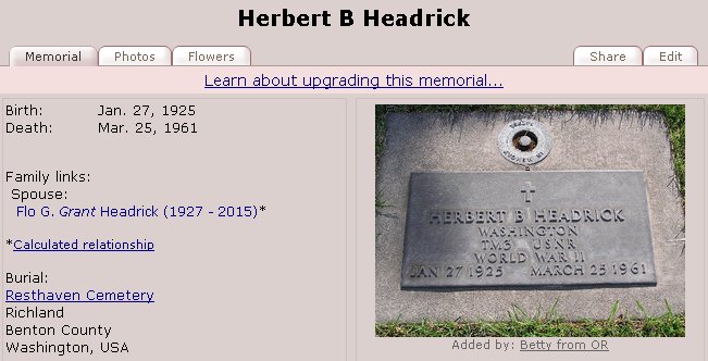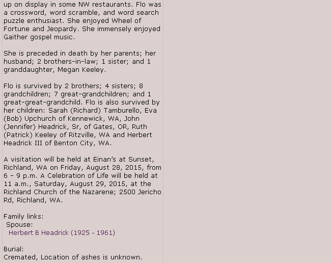 Flo Imogene Grant Headrick 1927-2015 (Herbert's wife)