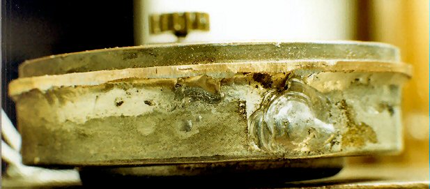 I was given one of these clocks and, since it did not run, I took the motor apart because I had nothing to lose. The best way to do this is to place the outermost edge against a stone grinding wheel, all the way around, removing about 1 mm. of circumference (see photos below), and pry it apart with a screwdriver. One side of the case has an extra quantity of solder which covers up a lubrication hole: pry open from the other side. The two brass plates inside are riveted together: grind off the rivets, of which there are four, and pry off the back plate. If you grind off just enough rivet to remove the plate, it would go on friction tight afterwards and this would not come apart by itself. The only thing that seems to go wrong with this motor is that the rotor is relatively heavy and this weight wears out the brass hole until the rotor rubs on the frame just next to it, stopping the clock. To remove the rotor, it is necessary to remove the 2nd gear with a staking tool or a punch. Clean all the parts thoroughly: automotive brake cleaner in a spray can works very well because it leaves no residue and is a very powerful solvent. Install a bushing at each end of the rotor, lubricate with a quality oil formulated for electric motors. You could mix a small amount of moly graphite grease with the oil (about 5%) for better results. Lubricate all the teeth of the bakelite (?) 2nd gear next to the rotor and its post. Be careful because these teeth are very fragile. Install a small steel washer between the 2nd wheel and the back plate to reduce friction because of wear in this area. Press the brass plates together again, stake the 2nd gear together again as it was, and place the exterior cover on again in the same position as before. I sealed the exterior with a piece of woven glass fabric insulating tape, but a piece of heat-resistant electrical insulating tape would work nicely.