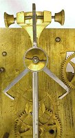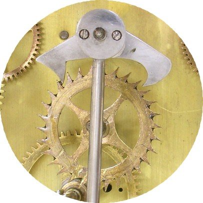 This Elliott has a Graham escapement, as it should. However, the parts to adjust the beat of the pendulum are above the escapment, and these parts are relatively heavy, taking power away from the pendulum. Additional weight will be required to overcome this design shortcoming. A comparable Herschede clock, by contrast, has the beat adjustment device mounted onto the pendulum itself, which is much better than having those parts adding weight to the pallet assembly. The pallet assembly should be as lightweight as possible. Furthermore, the pallets are shallow.