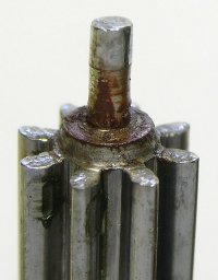 This clock was remarkably clean when it came in for repairs, which is often a red flag. It had chime problems only two years after its last overhaul. Upon disassembly, it was obvious that the person who overhauled this clock two years ago had experienced difficulties. The next photo shows the strike rack, loaded with plenty of oil, but it was supposed to be dry. To the left of the rack, you can see a gear behind it, similarly loaded with oil, but also supposed to be dry. Most of the gears were heavily oiled. Only the friction bearings, (the bushings and pivots), should be lubricated. There are other points of friction, such as the escapement, certain cams and levers, that should also be lubricated, but the racks and the gear teeth should be dry. Furthermore, an improper lubricant was used, as evidenced by the presence of rust on the third wheel pivot, shown in the following photo. This clock would not have run for much longer with that rust problem. A proper lubricant will lubricate and protect.