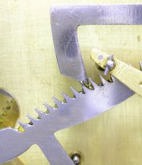 It was surprising to find a recoil escapement in this clock. Considering how much this clock once cost, you would expect it to have a Graham escapement. The angle of the entry pallet is too steep: can you see why? This is common in recoil escapements.