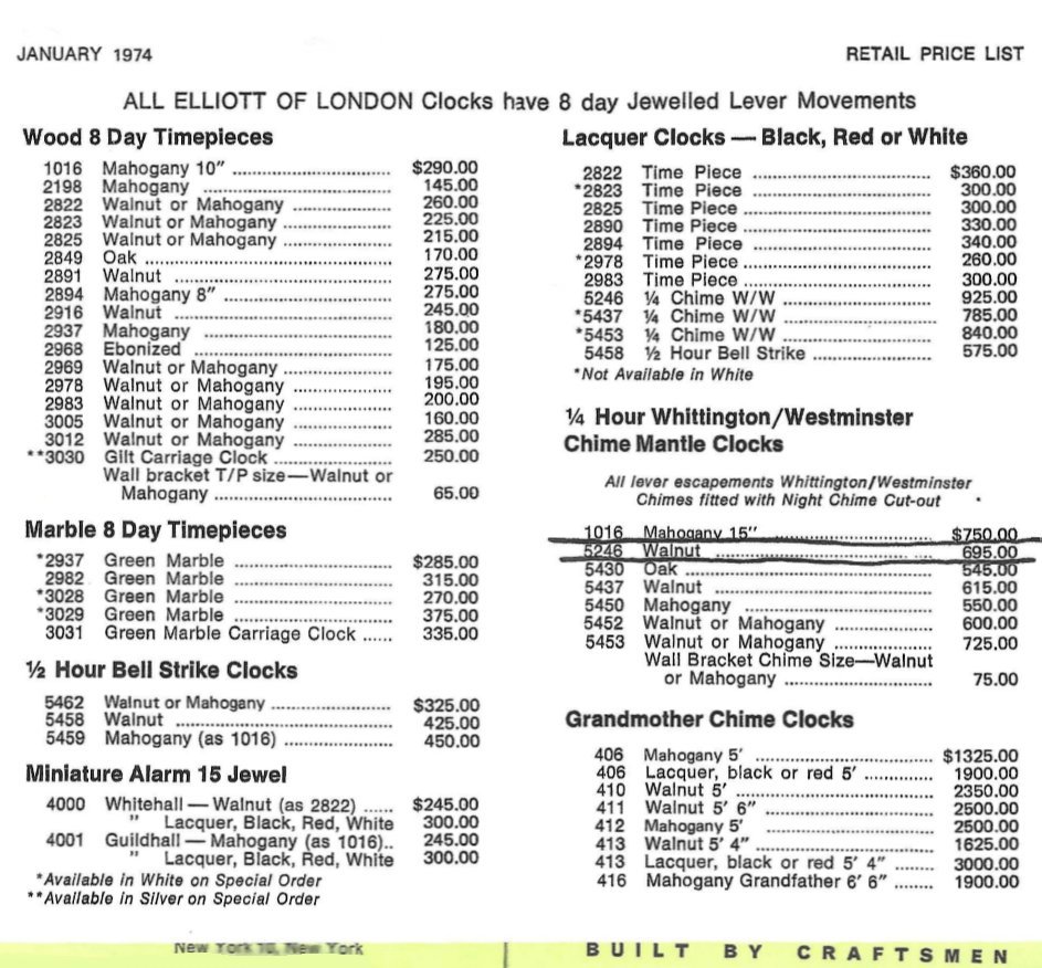 Here is an Elliott Clock Catalogue with price list. Remember that an Omega Speedmaster cost about $320, and a Rolex President cost about $1850 in 1974, so you could take the prices you find in this catalogue and multiply by ten to twenty times, in order to estimate what a comparable Elliott clock would cost in 2024!