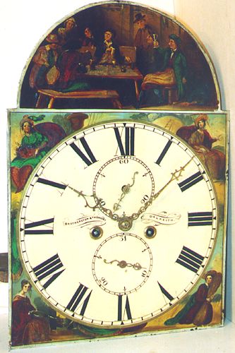 The minute numbering has disappeared completely and the hour numerals are back as Roman numerals, (I, II, III, IIII, V, VI, etc..) The corner decoration tends to be full colour scenes, often of country scenes, sometimes of the four seasons, countries (England, Scotland, Ireland, Wales) or the four continents. Sometimes there are specific corner or arch paintings to do with trade or commerce or perhaps with a religious or masonic theme."
