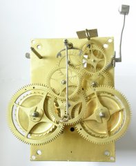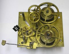 If you rotate the axis of rotation (the arbor or shaft) by 90° to a horizontal position, the hammer becomes a pendulum. The first clock to use a pendulum instead of a foliot or balance wheel was produced by the Dutch mathematician Christian Huygens in 1657 (although it is claimed that others invented the pendulum clock before he did), so you can see how the alarm mechanism formed the basis of the clock escapement to be used for timekeeping in the thirteenth century and beyond. The crown wheel was used in clocks and watches in England until about 1840, even though the anchor escapement for the pendulum clock had already been introduced in 1657. The recoil action of the two escapements is similar, if you consider the crown wheel as a three-dimensional escape wheel and the anchor escapement as having a two-dimensional escape wheel. You can read more about this: