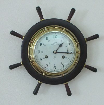 When you compare the Schatz clock with a Chelsea ship's bell clock of similar vintage, there are several obvious differences. The Chelsea is better made, with polished pinions and gold-plated brass gears. The Chelsea platform has a Swiss lever escapement with 11 jewels. The Chelsea costs many times more! Chelsea clocks in general are more difficult to work on than Schatz and other equivalent clocks, so repairs on Chelseas should not be attempted by those without at least five years of experience at the bench and some watch repair experience. Schatz clocks are no longer being manufactured, but Chelsea clocks are. Another manufacturer of ship's bell clocks that should be mentioned here is Hermle.