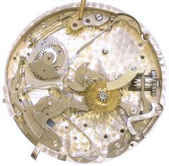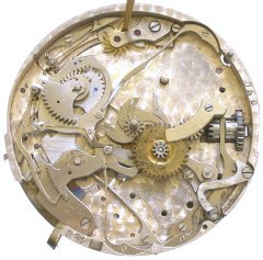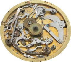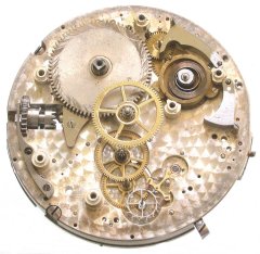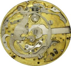 Here are the parts under the bridge plates. The repeater has a separate gear train and mainspring, independent of the time train. The two hammers that strike the gong are visible here. The pallet fork is made of brass, which is unusual.