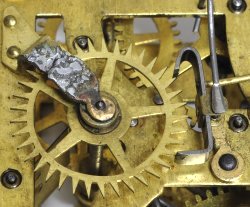 If you wind the mainsprings too tightly, or if stronger mainsprings are installed than were originally there, the result could be damage to the gear teeth. Whereas European clocks have mainspring barrels with long teeth for added strength, American clocks with open springs, (no barrel), have short teeth. The result is that all the torque of the mainspring is applied to a very small area of tooth such that, when the mainspring is fully wound, the teeth become compressed as the yield pressure of the metal is exceeded. The other gear in the photo below shows undamaged teeth. The compressed teeth look worn, but you do not see comparable wear on the lantern pinion of the second wheel, so you conclude that compression took place. Close inspection reveals that brass was pushed to the side, and the edges of the teeth are no longer smooth. Thinner mainsprings should be installed on this clock.