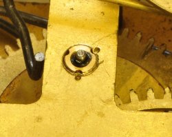 In order to avoid taking the clock apart, someone soldered a Rathburn bushing over a worn bushing. Apart from looking awful, this may have worked if the pivot had been polished. However, to polish the pivot, the entire clock must be disassembled, so you might as well install a friction bushing. Shortcuts are not worthwhile when it comes to bushings and pivots. Any time you see a Rathburn bushing, you should remove it when servicing the clock. The rough pivot was the reason why this clock would not run. In fact, all the pivots in this clock needed to be polished, some more rough than others. This is one of the problems with mass production: lack of attention to detail usually results in imperfectly-polished pivots.
