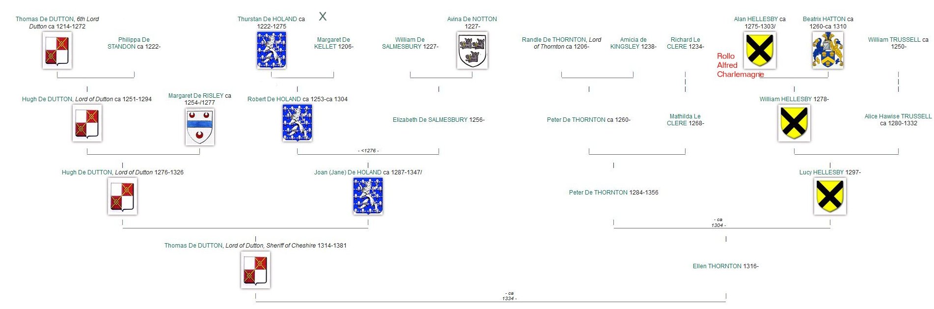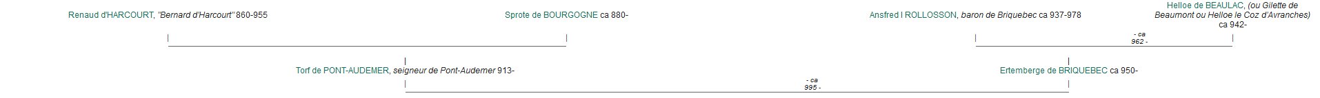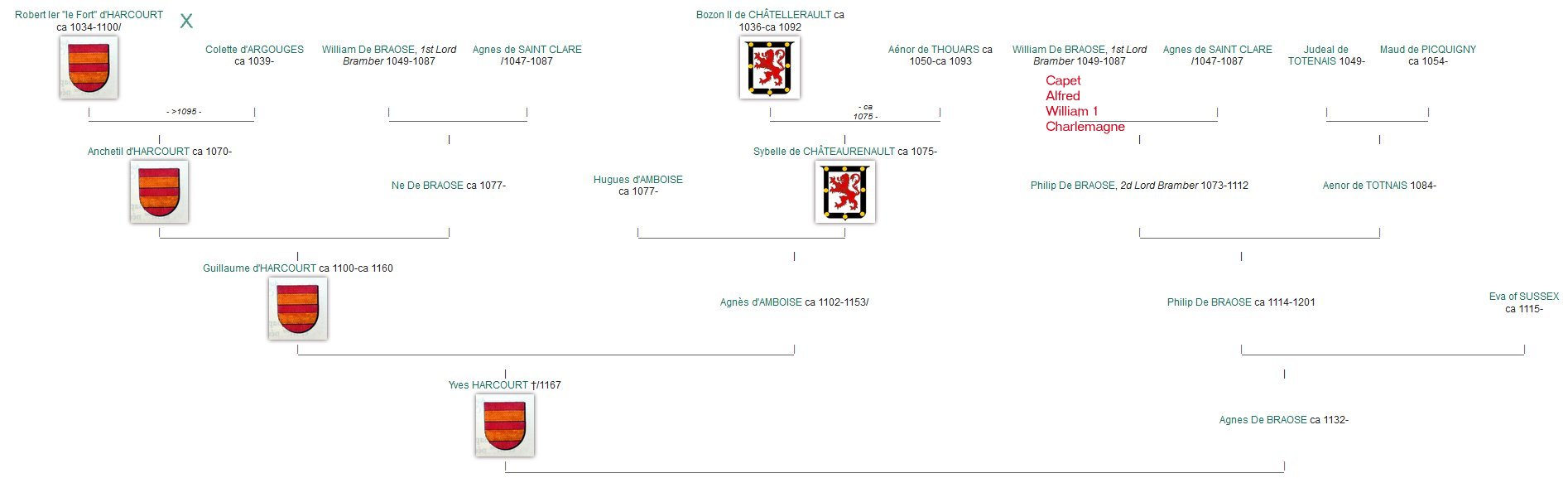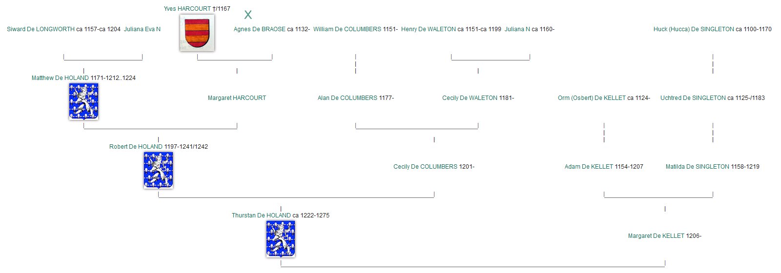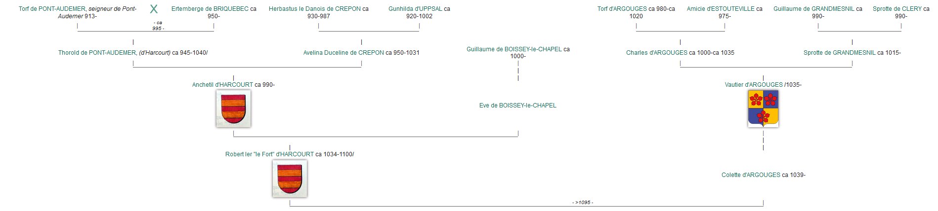 Bernard 'le Danois' de Pont-Audemer d'Harcourt, vicomte de Rouen (880-955) and Sprota de Bourgogne (890-945) Torf d'Harcourt de Pont-Audemer (914-1002) and Eremburge de Bricquebec (930-1003) Turchetil d'Harcourt (951-1024) and Adeline de Montfort (953-1030) Anchetil d'Harcourt (990-1034) and Ève de Boissey-le-Châtel (1008-1080) Robert d'Harcourt, de Cailleville, de Beauficel et de Boissey-le-Châtel (1034-1100) Guillaume d'Harcourt (1070-1149) and Agnes Hue d'Amboise (1102-1153) Ivo d'Harcourt (1130-1180) and Roese Peverel (1130-1185) Matthew de Holland (1175-1224) and Margaret de Harcourt (1165-1197) |