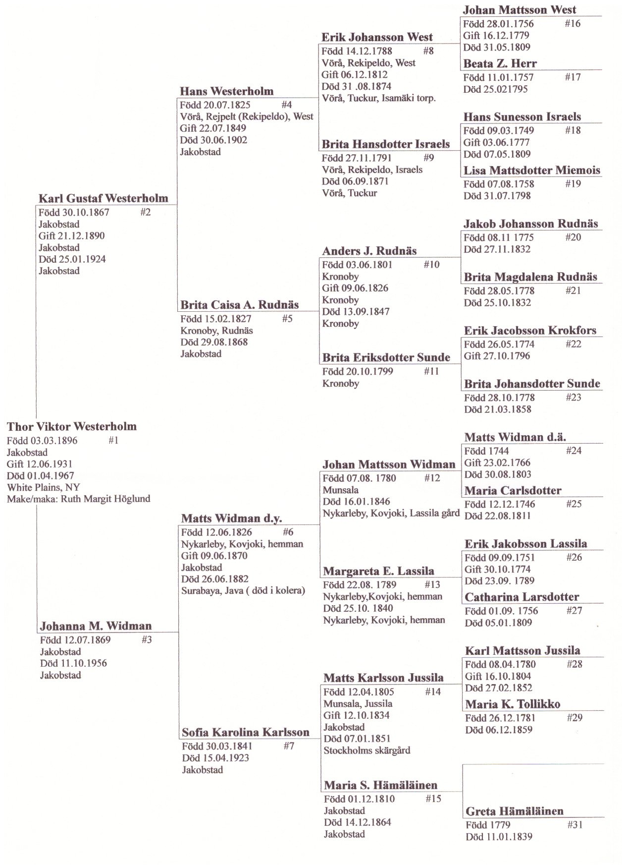 1 Thor Viktor Westerholm 1896-1967 2 Karl Gustaf Westerholm 1867-1924 3 Johanna Mattsdotter Widman 1869-1956 4 Hans Westerholm 1825-1902 5 Brita Caisa Andersdotter Rudnäs 1827-1868 6 Matts Widman 1826-1870 7 Sofia Karolina Karlsson 1841-1923 8 Erik Johansson West 1788-1874 9 Brita Hansdotter Israels 1791-1871 10 Anders J. Rudnäs 1801-1847 11 Birta Eriksdotter Sunde 1799- 12 Johan Mattsson Widman 1780-1846 13 Margareta Eriksdotter Lassila 1789-1840 14 Matts Karlsson Jussila 1805-1851 15 Maria S. Hämäläinen 1810-1864 16 Johan Mattsson West 1756-1809 17 Beata Z. Herr 1757-1795 18 Hans Sunesson Israels 1749-1809 19 Lisa Mattsdotter Miemois 1758-1798 20 Jakob Johansson Rudnäs 1775-1832 21 Brita Magdalena Rudnäs 1778-1832 22 Erik Jacobsson Krokfors 1774-1796 23 Brita Johansdotter Sunde 1778-1858 24 Matts Widman 1744-1803 25 Maria Carlsdotter 1746-1811 26 Erik Jakobsson Lassila 1751-1789 27 Catharina Larsdotter 1759-1809 28 Karl Mattson Jussila 1780-1852 29 Maria K. Tollikko 1781-1859 30 31 Greta Hämäläinen 1779-1839 |