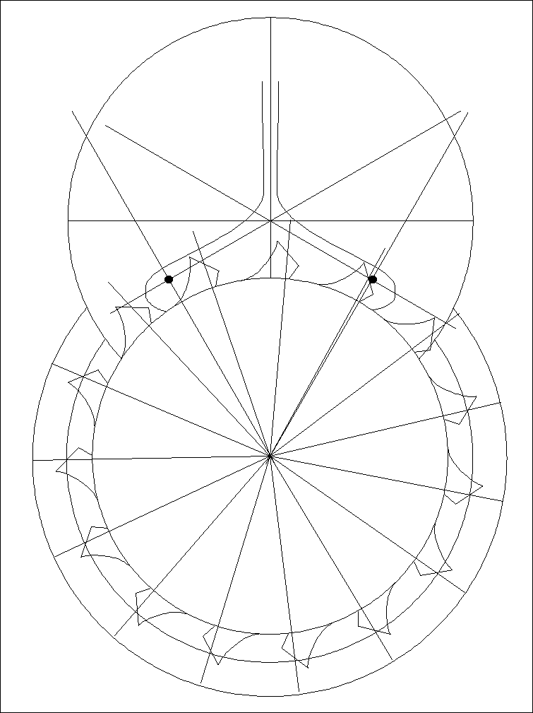 be bisected by the escape radius line, and the angle between these two lines should always be 45º. The pallets are bisected by the pallet circle's radii. The pallets are also bisected by the escape circle's radii, in order to have equidistant impulse. The amount of