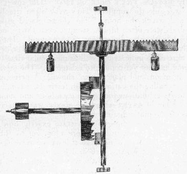 First, let us consider a clock consisting of a set of gears and a driving weight, using the force of gravity (see Fig. 1). In such a clock, the gears would spin uncontrollably unless a control mechanism were applied at the other end of the gear train. The control mechanism consists of an oscillating device that prevents the gear train from rotating, except at specific intervals, when it releases one tooth of the last gear in the train. By controlling the rate of rotation of the gears, it is possible to use this device to measure time by incorporating an indicator and a scale at the end of the shaft of one of the gears.